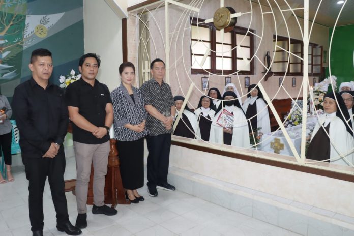 TOMOHON – Wali Kota Tomohon, Caroll Joram Azarias Senduk, S.H., bersama Ketua TP-PKK Kota Tomohon, drg. Jeand’arc Senduk-Karundeng melayat ke Biara St Theresia Karmel Kakaskasen, atas meninggalnya Suster Stephanie Ngala OCD, Sabtu (16/3/2024).