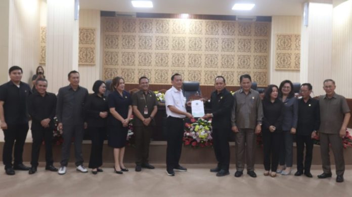 TOMOHON – Wali Kota Tomohon, Caroll Joram Azarias Senduk, S.H., mengikuti Rapat Paripurna DPRD Kota Tomohon dalam rangka Penyampaian Laporan Panitia Khusus dan Pendapat Akhir Fraksi – Fraksi, serta Pendapat Akhir Wali Kota Tomohon terhadap Rancangan Peraturan Daerah tentang Pedoman Pemberian Nama Jalan, Fasilitas Umum dan Penomoran Bangunan Gedung, Rabu (20/3/2024) di Ruang Sidang Kantor DPRD Kota Tomohon.