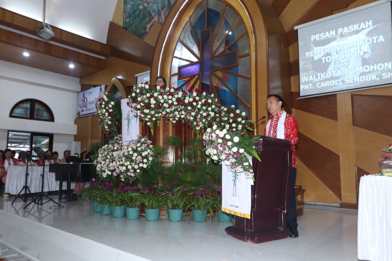 Dalam sambutannya Wali Kota Tomohon menyampaikan, dalam suasana penuh sukacita bersama umat kristiani di seluruh dunia, patutlah kita bersyukur atas kuasa allah yang telah menang atas maut, yang ditandai dengan peristiwa kebangkitan Yesus Kristus sebagai puncak karya keselamatan allah bagi umat manusia yang saat ini kita maknai melalui ibadah perayaan paskah tahun 2024.