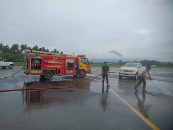 Hal ini disampaikan Kepala Satuan Polisi Pamong Praja (SatPol-PP) Kota Tomohon, Jusak ST Pandeirot, S.Pd., M.M, dimana pihaknya melakukan penyiraman sekaligus pembersihan debu vulkanik yang menutupi permukaan landasan Bandara Sam Ratulangi Manado.