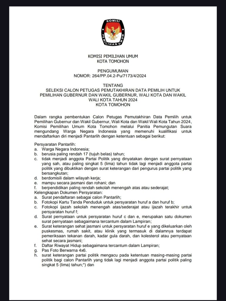 Pengumuman tersebut tertuang dalam Surat Edaran Pengumuman NOMOR: 264/PP.04.2-Pu/7173/4/2024 TENTANG SELEKSI CALON PETUGAS PEMUTAKHIRAN DATA PEMILIH UNTUK PEMILIHAN GUBERNUR DAN WAKIL GUBERNUR, WALI KOTA DAN WAKIL WALI KOTA TAHUN 2024 KOTA TOMOHON.