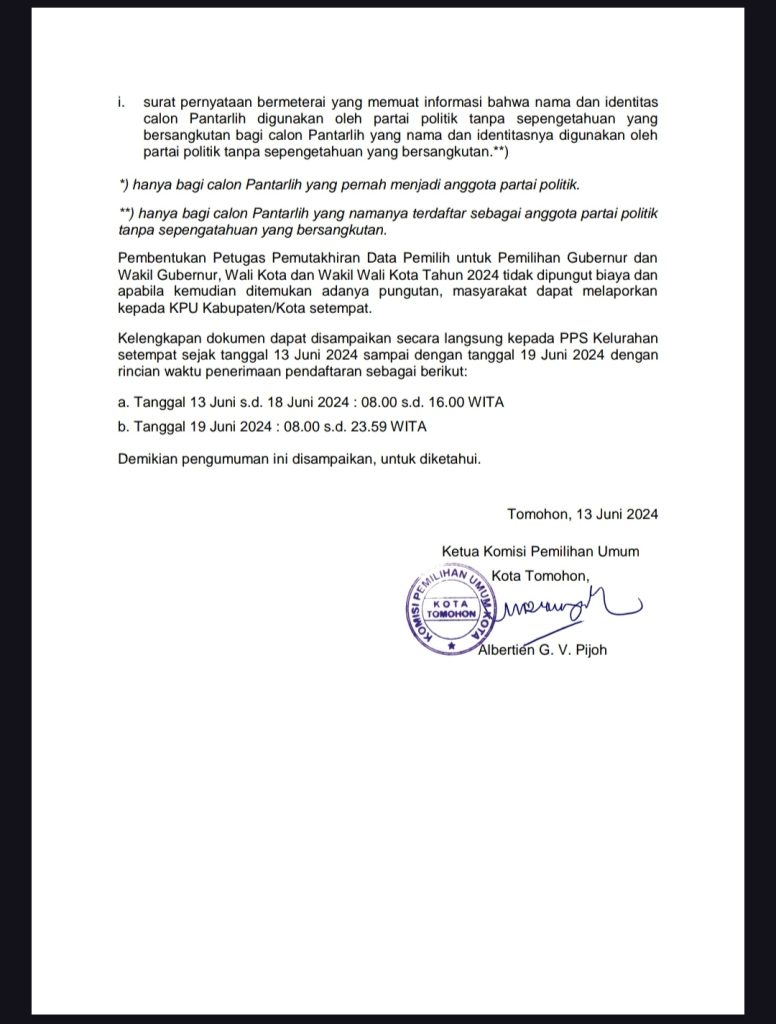 Pengumuman tersebut tertanggal 13 Juni 2024 ditandatangani langsung oleh Ketua KPU Kota Tomohon, Albertien G. V. Pijoh.