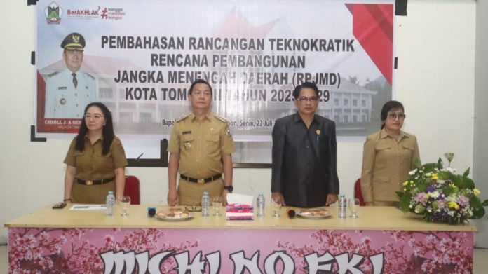 TOMOHON – Wali Kota Tomohon, Caroll J. A. Senduk, S.H memimpin Pembahasan dan Kesepakatan Rancangan Teknokratik Rencana Pembangunan Jangka Menengah Daerah (RPJMD) Kota Tomohon Tahun 2025-2029, Senin (22/7/2024) di Michi No Eki Pakewa Tomohon.