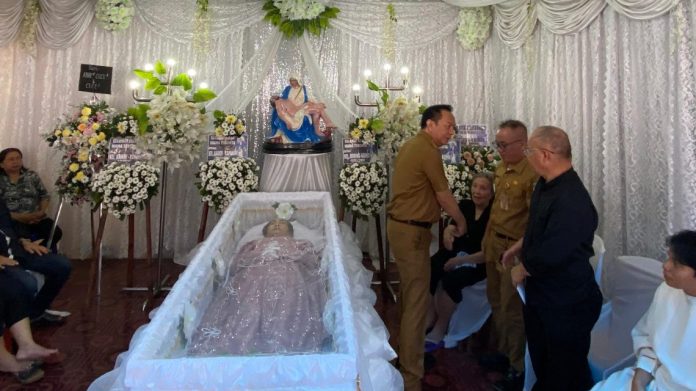 TOMOHON – Wali Kota Tomohon, Caroll Joram Azarias Senduk, S.H bersama Sekretaris Daerah Kota Tomohon, Edwin Roring, S.E., M.E melayat di Rumah Duka atas meninggalnya Almarhuma Jeanne Lucie Mandagie (Oma Yeni) dalam Keluarga Besar Kainde-Mandagie, Selasa (10/9/2024) di Kelurahan Tataaran Dua, Kecamatan Tondano Selatan.