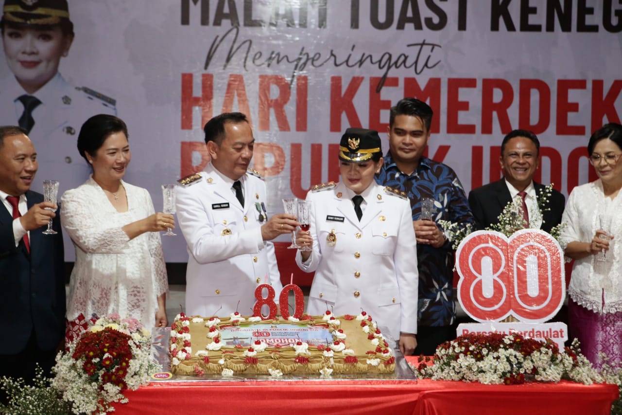 WALENEWS.COM, TOMOHON – Wali Kota Tomohon, Caroll Senduk, S.H bersama Ketua TP-PKK Kota Tomohon, drg. Jeand’arc Senduk-Karundeng, serta Wakil Wali Kota Tomohon, Sendy G. A. Rumajar, S.E., M.I.Kom., didampingi suami Ariel Warouw, menghadiri acara Toast Kenegaraan Pemerintah Kota (Pemkot) Tomohon dalam rangka memperingati HUT ke-80 Proklamasi Kemerdekaan Republik Indonesia. Kegiatan ini berlangsung di Stadion Babe Palar, Tomohon, Minggu (17/8/2025).