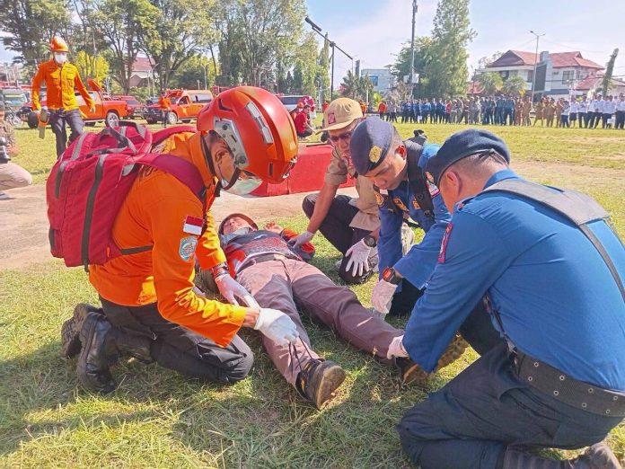 Simulasi ini melibatkan tim gabungan yang terintegrasi, termasuk Badan Penanggulangan Bencana Daerah (BPBD), Badan SAR Nasional (Basarnas), Taruna Siaga Bencana (Tagana), Dinas Kesehatan, PLN, serta jajaran Forum Komunikasi Pimpinan Daerah (Forkopimda).