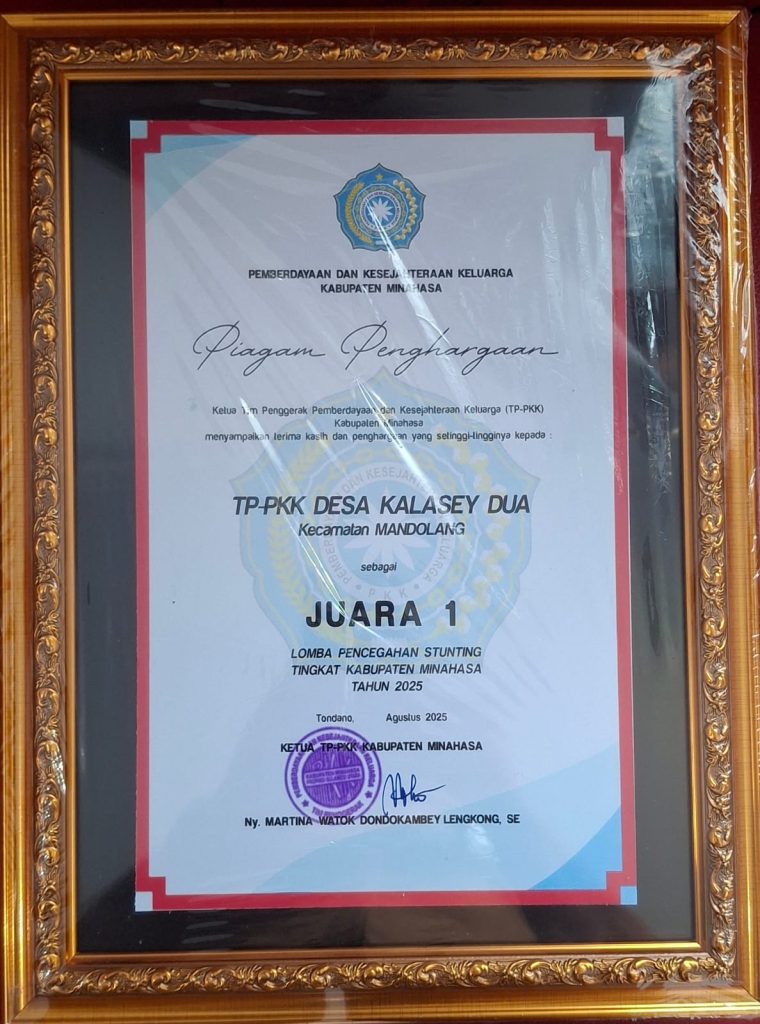 WALENEWS.COM, Minahasa – Pemerintah Desa Kalasey Dua bersama TP-PKK Kalasey Dua menjuarai lomba penanganan stunting tingkat Kabupaten Minahasa, pada 18 Desember 2025, di Hotel Manado Tateli Resort and Convention.