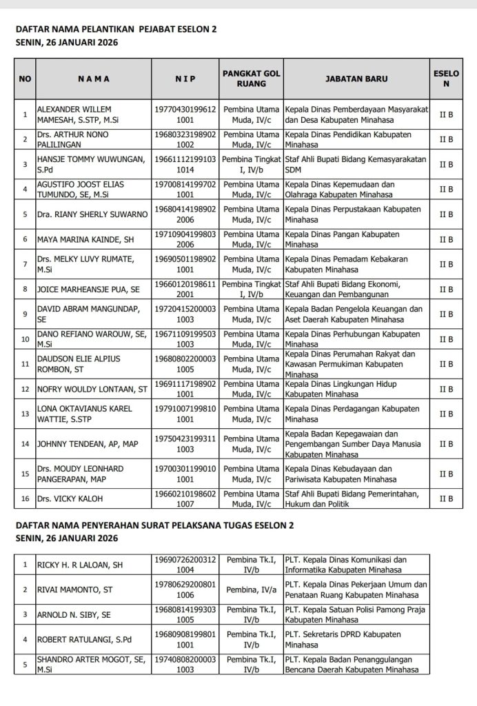 WALENEWS.COM, Minahasa – Pemerintah Kabupaten Minahasa melantik dan mengambil sumpah janji aparatur sipil negara (ASN) dalam Jabatan Pimpinan Tinggi Pratama, Senin, 26 Januari 2026.