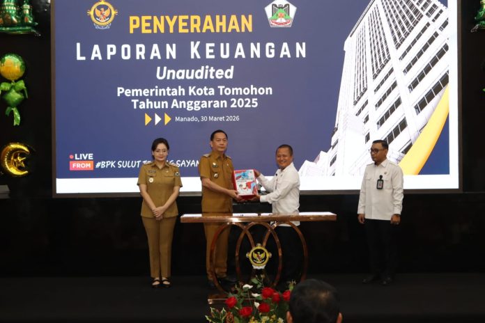 WALENEWS.COM, Manado – Wali Kota Tomohon Caroll Joram Azarias Senduk, S.H. bersama Wakil Wali Kota Sendy Gladys Adolfina Rumajar, S.E., M.I.Kom. menghadiri agenda penting Penyerahan Laporan Keuangan Unaudited Pemerintah Daerah Se-Provinsi Sulawesi Utara Tahun Anggaran 2025.