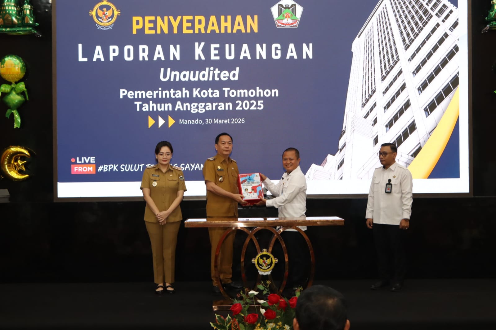 Dalam kesempatan tersebut, Wali Kota Caroll Senduk didampingi Wakil Wali Kota Sendy Rumajar secara resmi menyerahkan dokumen Laporan Keuangan Pemerintah Daerah (LKPD) Kota Tomohon Unaudited Tahun Anggaran 2025 kepada Kepala BPK Perwakilan Sulawesi Utara, Bombit Agus Mulyo, S.E. M.M., Ak., CA., ERMAP., GRCP., GRCA., CSFA.